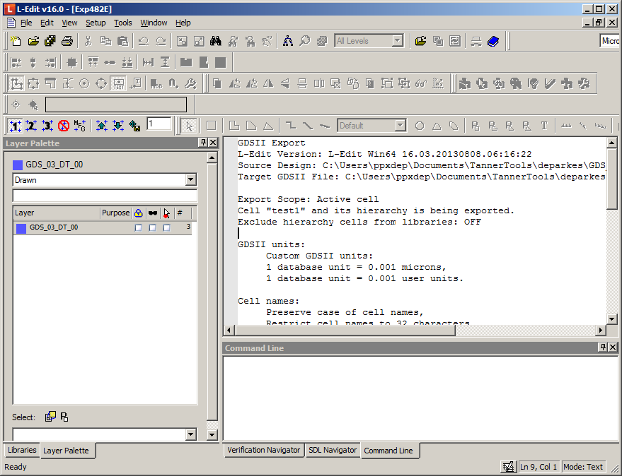 When you output a GDS file from L-edit a log file will be produced inside your L-Edit design. This file will tell you the export settings and let you know if there have been any warnings or errors.
