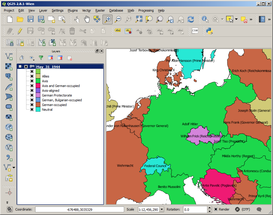 Using QGIS it’s easy load the shapefiles to view and manipulate them. Here I’ve colour coded the regions according to foreign policy situation and labelled with the head of state at the time.