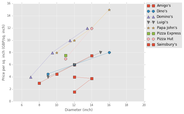 There are plenty of places you can see a complete comparison of the R vs python ggplot implementations, so I’ll just give you a quick flavour of what to expect. I recently plotted data about pizza prices. Using straight matplotlib, the output graph looks like this: