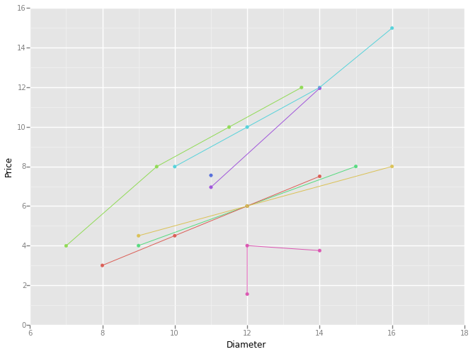ggplot(prices, aes(x='Diameter', y='Price',color="establishment_name")) +\