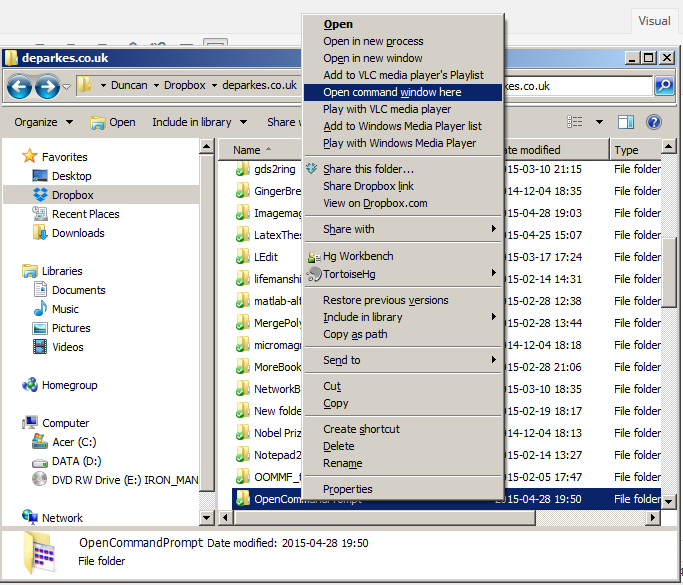 It can often be useful to be able to open a command prompt in windows. This post will show you how to start a command prompt in a target folder, so to avoid having to load a prompt by typing ‘cmd’ at the start menu, and labouriously navigating through your folders to the one you want. The command prompt can be very useful for running command-line programs, batch processing and your own scripts.