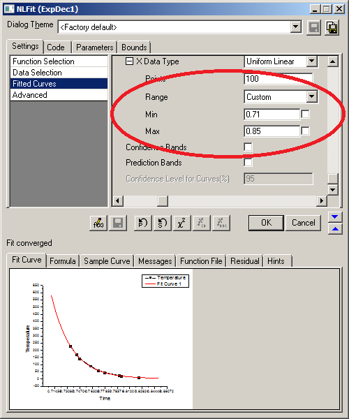 Hit ‘Fit Till Converged’ and you’ll see that the fit now extends beyond the original data range. (I found that I sometimes had to click on some of the grey background of the settings window, near to the Min/Max numbers for them to be ‘set’.) If you don’t have a definite range you need to show, you might need to play around with the maximum and minimum values until you have a range you are happy with (make sure you hit ‘Fit Till Converged’ each time).