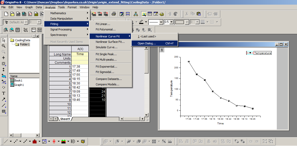 The first stage is to select your fit function as you would do normally. In my case I have some data showing cooling over time, which I’ll fit with a simple falling exponential, via the non-linear curve fitting tool.