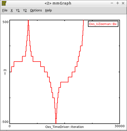 If we run the exchspring.mif example that comes with oxsi (making sure to capture the output to mmGraph) we can seee that the applied magnetic field changes as the simulation progresses: