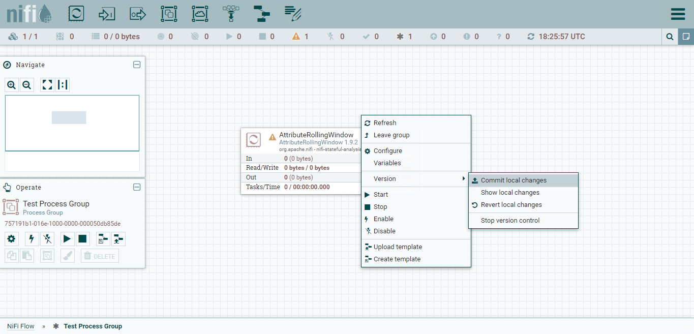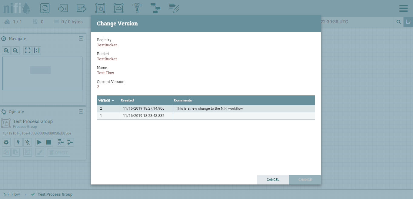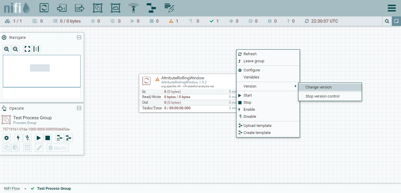 Once you have committed a version of your workflow to the NiFi registry you can go back to it if you need to. Right click in the workflow window and go to ‘version’, then ‘change version’ to bring up list of available versions.