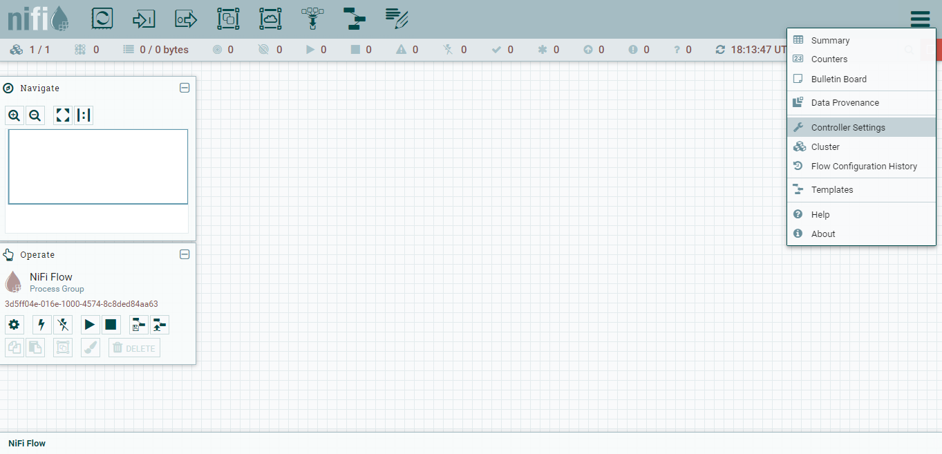 Firstly we need to configure the NiFi to know about the NiFi registry we just set up. We can do this via the hamburger button in the top right of the main NiFi screen.