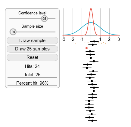 This post goes into some of the theory behind confidence intervals and points you to a great interactive tool for understanding them.
