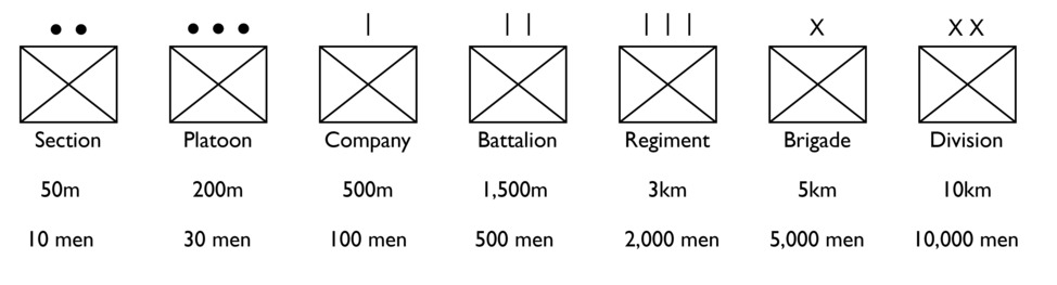 The summary of WW2 unit frontages is in the schematic below. There’s not too much to highlight at this stage other than that the ‘brigade’ is included more for completeness, since by the Second World War, the brigade was falling out of use.